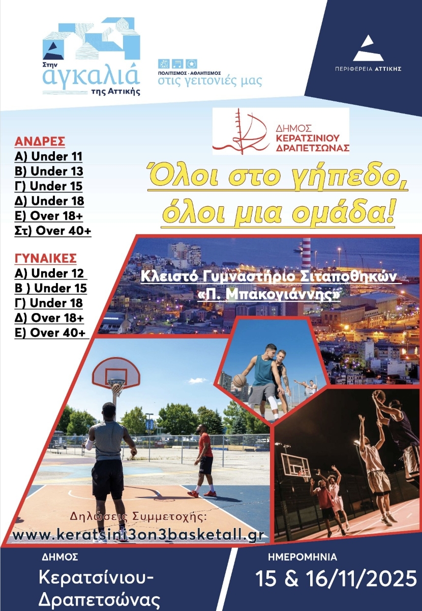 Έρχεται το τουρνουά μπάσκετ 3×3 “Keratsini 3on3 Basketball” που διοργανώνει ο Δήμος Κερατσινίου – Δραπετσώνας σε συνεργασία με την Περιφέρεια Αττικής. Το τουρνουά θα πραγματοποιηθεί το Σαββατοκύριακο 15 – 16 Νοεμβρίου 2025 στου προαύλιο του Κλειστού Γυμναστηρίου Σιταποθηκών “Π. Μπακογιάννης” (Γαληνού 4, Κερατσίνι) και κατά τις ώρες 4.00′ μ.μ. – 10.00′ μ.μ.