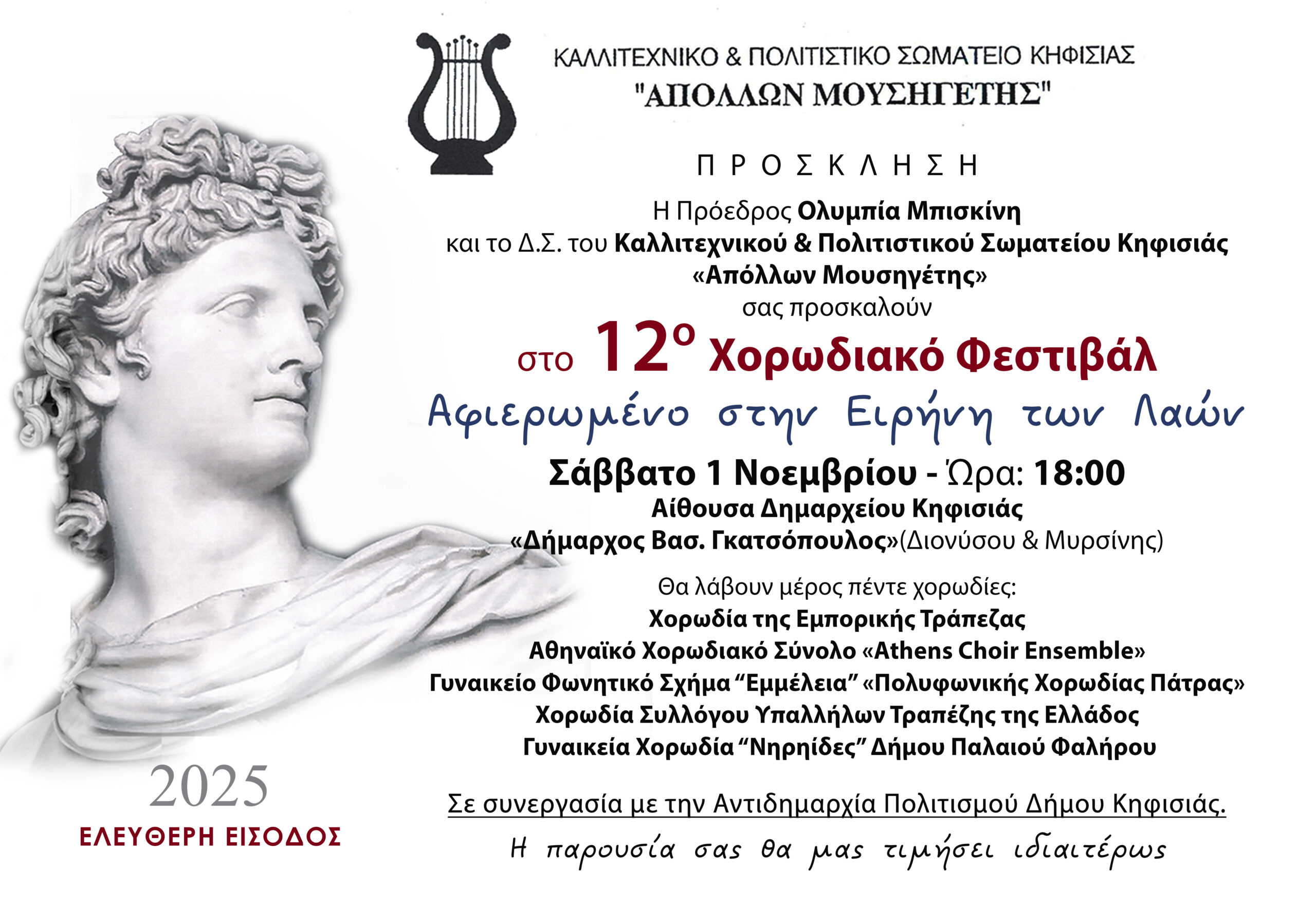 Η Πρόεδρος Ολυμπία Μπισκίνη και το Δ.Σ. του Καλλιτεχνικού και Πολιτιστικού Σωματείου Κηφισιάς «Απόλλων Μουσηγέτης» σας προσκαλούν στο 12ο Χορωδιακό Φεστιβάλ που θα πραγματοποιηθεί το Σάββατο 1 Νοεμβρίου 2025, στις 18:00′ στην Αίθουσα Δημαρχείου Κηφισιάς «Δήμαρχος Βασ. Γκατσόπουλος» (Διονύσου & Μυρσίνης), με τη στήριξη της Αντιδημαρχίας Πολιτισμού του Δήμου Κηφισιάς.