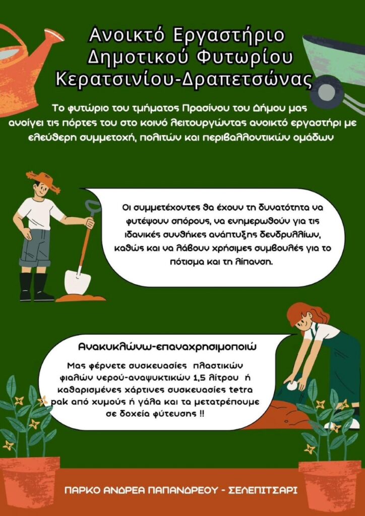 Το Τμήμα Πρασίνου του Δήμου Κερατσινίου-Δραπετσώνας σε συνεργασία με την εθελοντική ομάδα ΕΘΕΛΟΝΤΕΣ ΠΕΡΙΒΑΛΛΟΝΤΟΣ ΚΕΡΑΤΣΙΝΙΟΥ διοργανώνει για πρώτη φορά ανοικτό εργαστήρι προς το κοινό με ελεύθερη συμμετοχή πολιτών και περιβαλλοντικών ομάδων.