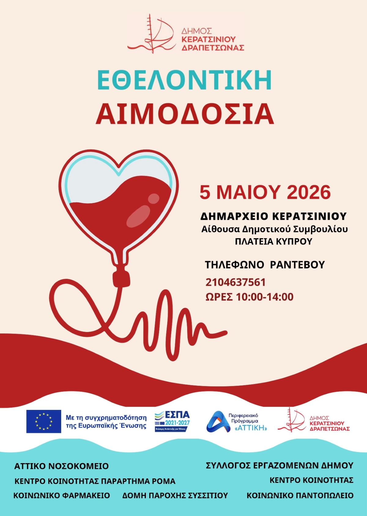 Υπενθυμίζουμε ότι ο Δήμος μας, ο Σύλλογος Εργαζομένων του, το Κέντρο Κοινότητας, το Κέντρο Κοινότητας – Παράρτημα Ρομά και οι κοινωνικές δομές, Παροχής Συσσιτίου, Κοινωνικού Φαρμακείου και Παντοπωλείου, σε συνεργασία με το Π.Γ.Ν. «Αττικό», καλεί για άλλη μια φορά τους δημότες του να ανταποκριθούν στην Εθελοντική Αιμοδοσία που θα πραγματοποιηθεί την Τρίτη 5 Μαΐου στην Αίθουσα Δημοτικού Συμβουλίου ( Ελ. Βενιζέλου 200, 1ος όροφος, Δημαρχείο Κερατσινίου)