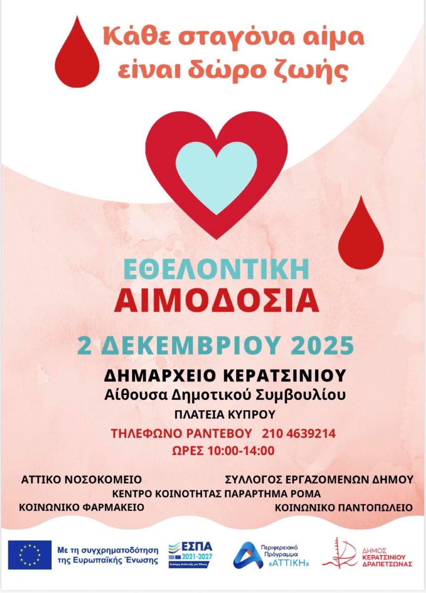 Εθελοντική αιμοδοσία διοργανώνεται από τον Δήμο Κερατσινίου – Δραπετσώνας και τον Σύλλογο Εργαζομένων του Δήμου σε συνεργασία με το Π.Γ.Ν. “Αττικόν”. Η δράση θα πραγματοποιηθεί την Τρίτη, 2 Δεκεμβρίου 2025 από τις 10.00′ π.μ. έως τις 2.00′ μ.μ. στην Αίθουσα Δημοτικού Συμβουλίου (Ελ. Βενιζέλου 200, 1ος όροφος, Δημαρχείο Κερατσινίου).