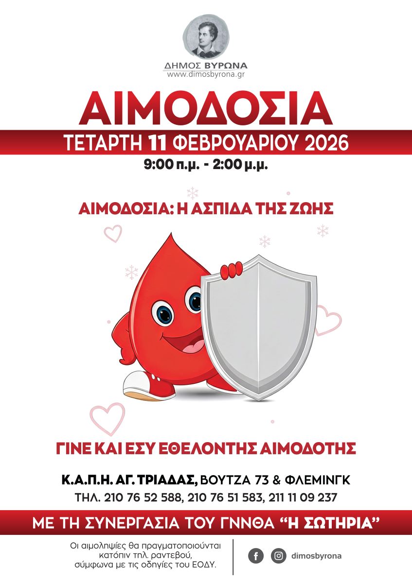 Εθελοντική Αιμοδοσία διοργανώνεται στον Δήμο Βύρωνα, σε συνεργασία του Δήμου με το Γ.Ν.Ν.Θ.Α. “Η ΣΩΤΗΡΙΑ”. Η δράση θα πραγματοποιηθεί την Τετάρτη, 11 Φεβρουαρίου 2026, κατά τις ώρες 9.00′ π.μ. – 2.00′ μ.μ., στο Κ.Α.Π.Η. Αγίας Τριάδας (Βουτζά 73 & Φλέμινγκ – Εντευκτήριο Προσκόπων). “Μια στάση αγάπης, μια ασπίδα ζωής”, αναφέρει χαρακτηριστικά η ανακοίνωση – κάλεσμα του γραφείου τύπου του Δήμου.