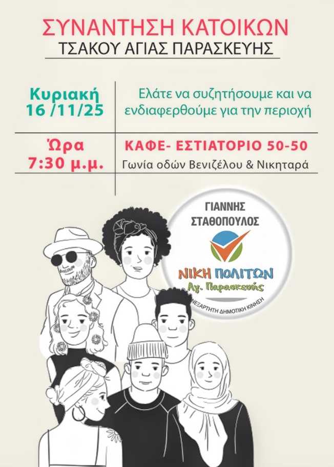 Σε συζήτηση ενόψει του προϋπολογισμού καλεί ο πρ. Δήμαρχος Γιάννης Σταθόπουλος στον Τσακό, την Κυριακή 16 Νοεμβρίου 7.30 μ.μ. στο καφεστιατόριο «50-50», Ελ. Βενιζέλου και Νικηταρά 22.