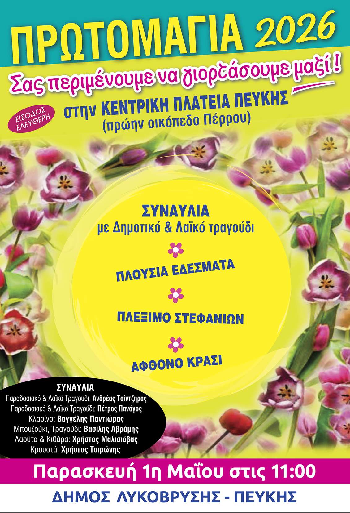 Ο Δήμαρχος Λυκόβρυσης-Πεύκης κ. Μάριος Ψυχάλης δηλώνει: “Η Πρωτομαγιά δεν είναι μια απλή μέρα στο ημερολόγιο. Είναι μια γιορτή της Φύσης και της Άνοιξης, ένα κάλεσμα και μια ευκαιρία να βγούμε και να συναντηθούμε έξω ξανά, σε ένα περιβάλλον πλημμυρισμένο με χρώματα, μουσικές και μυρωδιές από ανοιξιάτικα λουλούδια, αποδεικνύοντας τη δύναμη της συλλογικότητας και της αλληλεγγύης. Σας περιμένουμε όλες και όλους στην Κεντρική Πλατεία Πεύκης για να τη ζήσουμε όλοι μαζί, σαν μια μεγάλη αγκαλιά αισιοδοξίας και χαράς”.