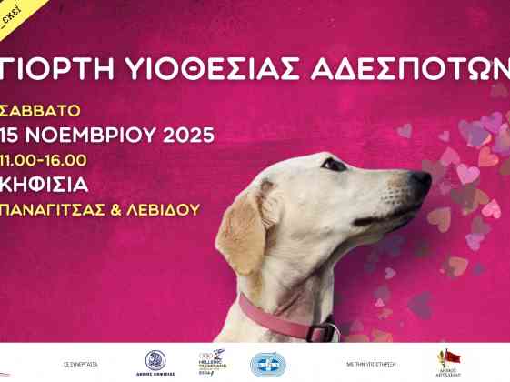 Με ιδιαίτερη χαρά σας προσκαλούμε το Σάββατο 15 Νοεμβρίου 2025, από τις 11:00′ π.μ. – 4:00′ μ.μ. στο κέντρο της Κηφισιάς, στη συμβολή των οδών Παναγίτσας και Λεβίδου, σε μια μεγάλη γιορτή υιοθεσίας αδέσποτων ζώων, που πραγματοποιείται σε συνεργασία με το Φιλοζωικό Σύλλογο Αιγιαλείας.