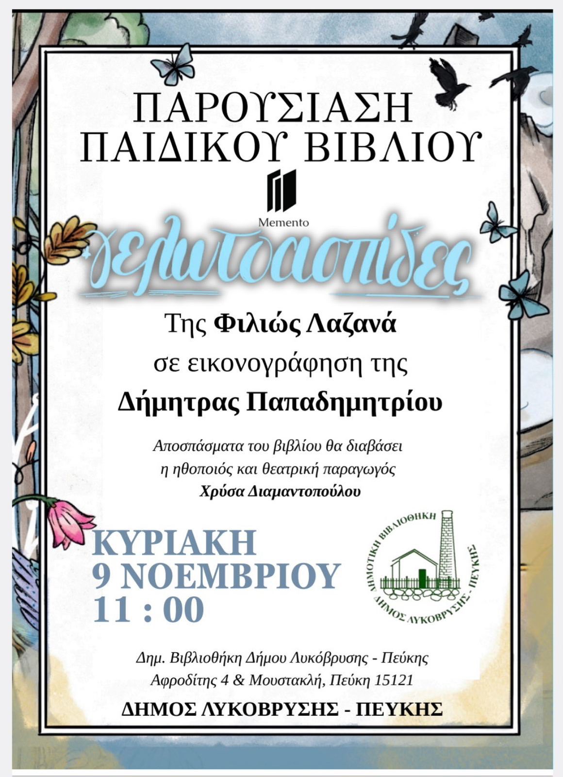 Η Δημοτική Βιβλιοθήκη Λυκόβρυσης – Πεύκης και οι εκδόσεις “Memento” παρουσιάζουν το παιδικό βιβλίο “Γελωτοασπίδες”. Η εκδήλωση θα πραγματοποιηθεί την Κυριακή, 9 Νοεμβρίου 2025, στις 11.00′ π.μ. στη Δημοτική Βιβλιοθήκη του Δήμου Λυκόβρυσης-Πεύκης (Αφροδίτης 4 και Μουστακλή, στην Πεύκη).