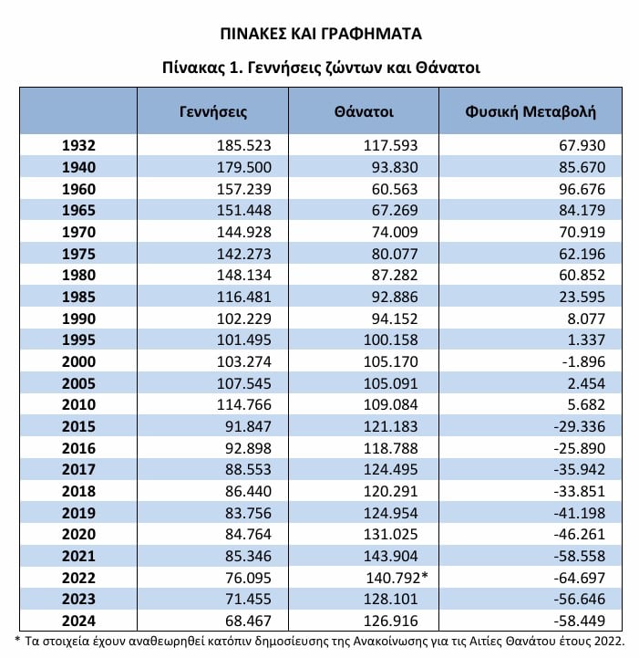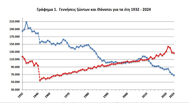 Κατά 58.449 ανθρώπους λιγότεροι είμαστε από το 2024, αφού αυτή ήταν η διαφορά θανάτων και γεννήσεων, σύμφωνα με τα στοιχεία της Ελληνικής Στατιστικής Αρχής.