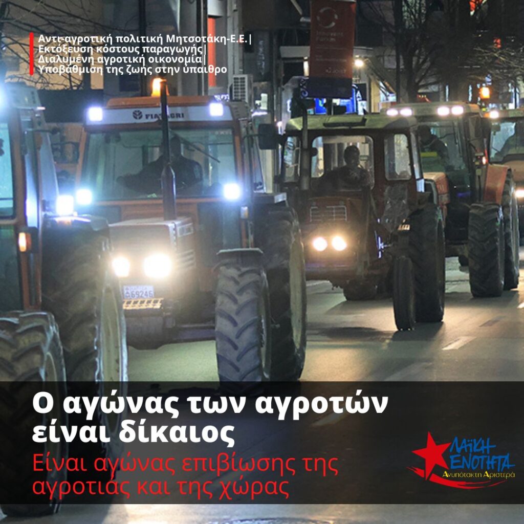 Η Λαϊκή Ενότητα – Ανυπότακτη Αριστερά χαιρετίζει τις κινητοποιήσεις αγροτών και κτηνοτρόφων, συμπαραστέκεται στον αγώνα τους και απαιτεί την ικανοποίηση των αιτημάτων τους.