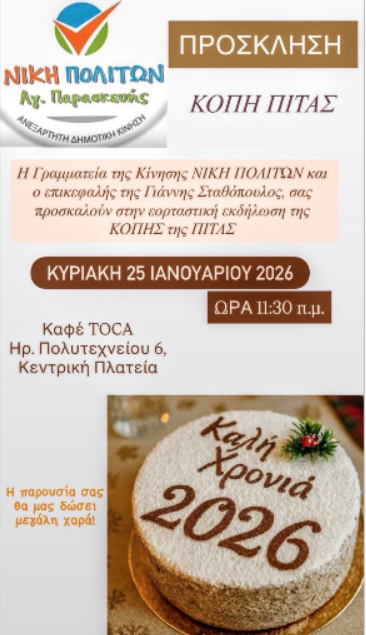 Τα μέλη της Γραμματείας της Ανεξάρτητης Δημοτικής Κίνησης «ΝΙΚΗ ΠΟΛΙΤΩΝ Αγ. Παρασκευής» και ο επικεφαλής Γιάννης Σταθόπουλος, Δήμαρχος 2014–19, σας προσκαλούμε την Κυριακή 25 Ιανουαρίου, στις 11.30′ π.μ., στην εκδήλωση κοπής της Πρωτοχρονιάτικης βασιλόπιτας στο cafe TOCA, οδός Ηρώων Πολυτεχνείου 6 Κεντρική Πλατεία.
