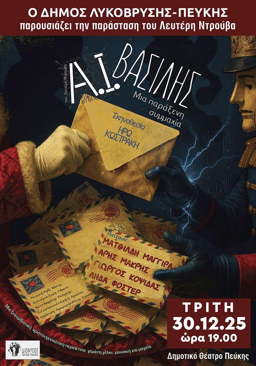 Ο Δήμος Λυκόβρυσης – Πεύκης προσκαλεί μικρούς και μεγάλους σε μια ξεχωριστή θεατρική εμπειρία γεμάτη φαντασία, γέλιο και χριστουγεννιάτικη μαγεία. Την Τρίτη 30 Δεκεμβρίου 2025, στις 19:00′, στο Δημοτικό Θέατρο Πεύκης, παρουσιάζεται η παράσταση «A.I. Βασίλης – Μια παράξενη συμμαχία», σε σκηνοθεσία Ηρούς Κοστράκη.