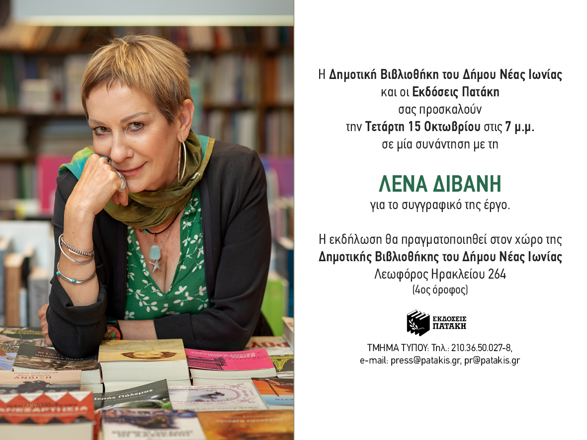 Σε συνάντηση με τη συγγραφέα Λένα Διβάνη προσκαλεί η Δημοτική Βιβλιοθήκη του Δήμου Νέας Ιωνίας την Τετάρτη 15 Οκτωβρίου στις 7 μ.μ.