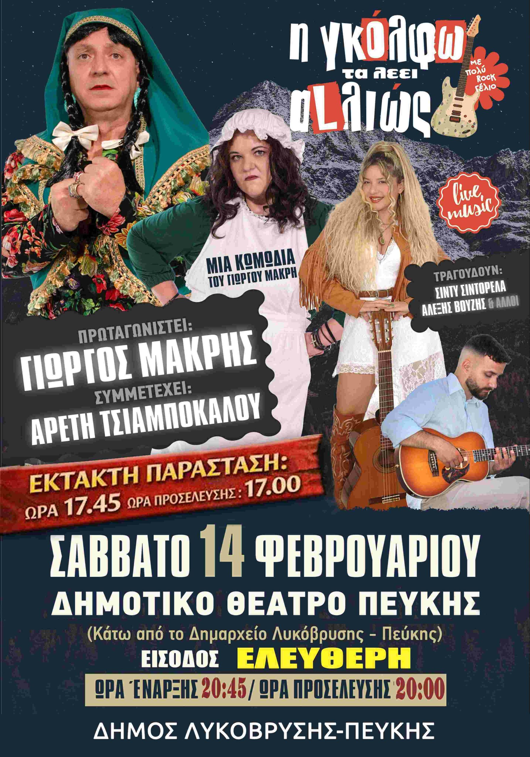 Η βουκολική κωμωδία “Η Γκόλφω τα λέει αλλιώς” παρουσιάζεται στο Δημοτικό Θέατρο Πεύκης. Η παράσταση θα λάβει χώρα το Σάββατο, 14 Φεβρουαρίου 2026, στις 8.45′ μ.μ.