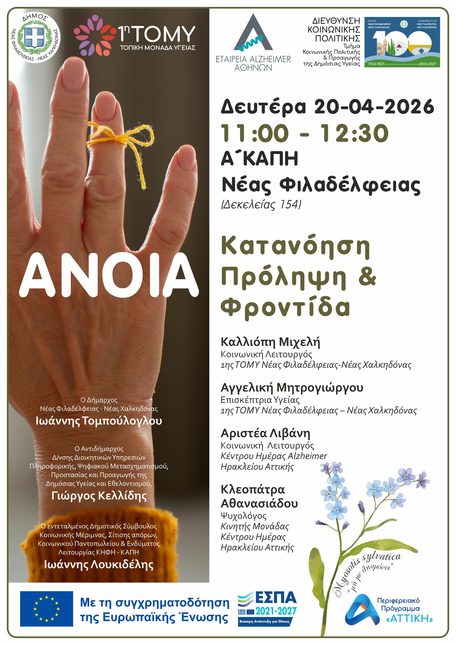 Η ενημερωτική δράση θα πραγματοποιηθεί τη Δευτέρα 20/04 και ώρα 11.00‘ π.μ. στο Α’ ΚΑΠΗ Νέας Φιλαδέλφειας (Δεκελείας 154), στοχεύοντας στην ενημέρωση και ευαισθητοποίηση της τοπικής κοινωνίας σχετικά με την πρόληψη, την έγκαιρη διάγνωση και τη διαχείριση της άνοιας, καθώς και στη στήριξη των ατόμων που ζουν με τη νόσο και των οικογενειών τους.