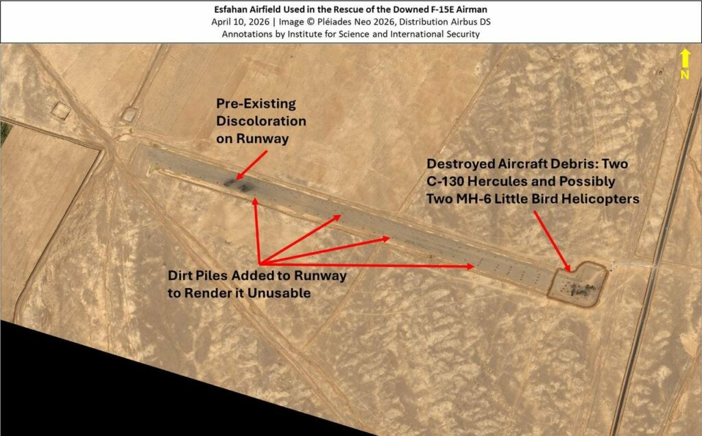 Μετά τη μάχη, δορυφορικές εικόνες δείχνουν ότι το Ιράν έστησε χωμάτινους λόφους γύρω από το σημείο της συντριβής και έριξε χώμα στον διάδρομο.
