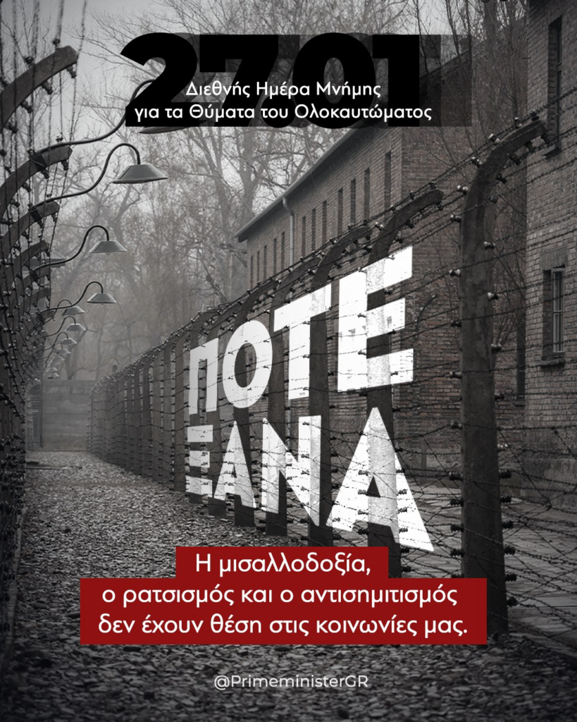 «Γιατί το Ολοκαύτωμα δεν είναι μόνο ένα ιστορικό γεγονός με ξεχωριστό βάρος. Είναι και μια διαρκής προειδοποίηση ότι η μισαλλοδοξία, ο ρατσισμός και ο αντισημιτισμός δεν έχουν θέση στις κοινωνίες μας. Γι’ αυτό και παραμένουμε σε εγρήγορση απέναντι στις δυνάμεις του μίσους και του διχασμού» είπε.
