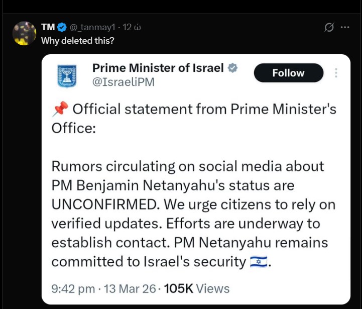 Προ ωρών αναρτήθηκε μήνυμα στον επίσημο λογαριασμό του ισραηλινού πρωθυπουργού στο X που ενέτεινε τις φήμες, το οποίο σε μικρό χρονικό διάστημα κατέβηκε. Το εντυπωσιακό είναι πως στο μήνυμα αναφέρερονται οι φήμες ως “ανεπιβεβαίωτες” και όχι ως ψευδείς.
