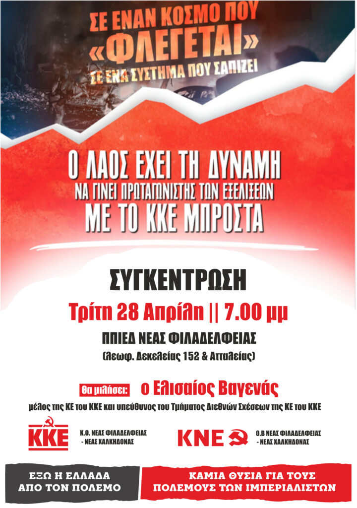 Με θέμα «Σε έναν κόσμο που φλέγεται, σε ένα σύστημα που σαπίζει, ο λαός έχει τη δύναμη να γίνει πρωταγωνιστής των εξελίξεων με το ΚΚΕ μπροστά» οι οργανώσεις Νέας Φιλαδέλφειας – Νέα Χαλκηδόνας του ΚΚΕ και της ΚΝΕ διοργανώνουν συγκέντρωση την Τρίτη 28 Απρίλη, στις 19:00, στο ΠΠΙΕΔ ΝΕΑΣ ΦΙΛΑΔΕΛΦΕΙΑΣ (λεωφ. Δεκελείας 152 & Ατταλείας).