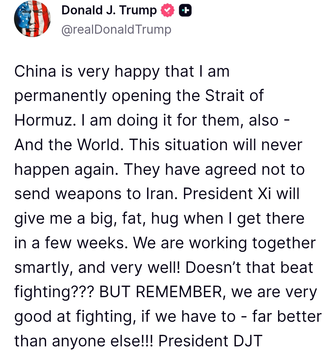Ο Πρόεδρος Σι θα μου δώσει μια μεγάλη, χοντρή αγκαλιά όταν πάω εκεί σε λίγες εβδομάδες. Συνεργαζόμαστε έξυπνα και πολύ καλά! Δεν είναι αυτό καλύτερο από το να πολεμάμε;;;