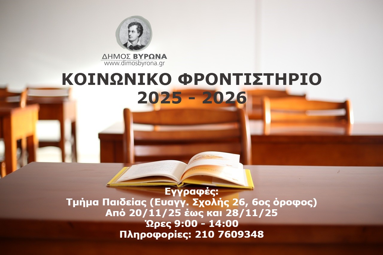 Το Κοινωνικό Φροντιστήριο θα λειτουργήσει και φέτος στο Δήμο Βύρωνα, όπως αναφέρει η σχετική ανακοίνωση του γραφείου τύπου του Δήμου. Οι ενδιαφερόμενοι γονείς θα πρέπει να υποβάλλουν τη σχετική αίτηση, καθώς και τα δικαιολογητικά, στην ιστοσελίδα του Δήμου ή αυτοπροσώπως στο Τμήμα Παιδείας μέχρι και τις 28 Νοεμβρίου 2025.