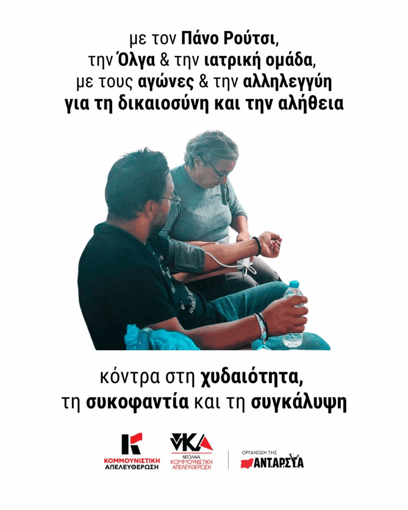 Ως Κομμουνιστική Απελευθέρωση δηλώνουμε με τον πιο κατηγορηματικό τρόπο πως δεν είναι μόνη της. Έχει μαζί της τους συντρόφους/ισσες της, τους συναγωνιστές/τριες της, το μαχόμενο υγειονομικό κίνημα, το ευρύτερο εργατικό λαϊκό κίνημα τους ασθενείς της.