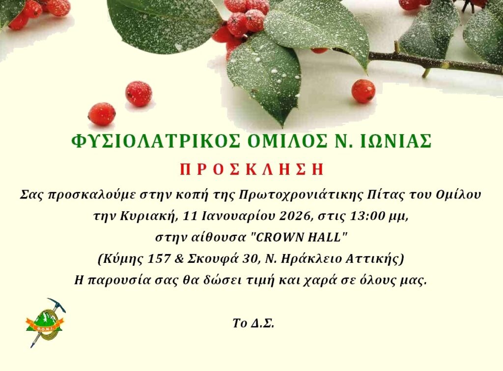 Την Κυριακή 11 Ιανουαρίου, στις 13:00, στην αίθουσα «Crown Hall» (Κύμης 156 & Σκουφά 30, Ηράκλειο Αττικής), διοργανώνει την ετήσια κοπή πίτας ο Φυσιολατρικός Όμιλος Νέας Ιωνίας, προσκαλώντας μέλη και φίλους να συμμετέχουν.