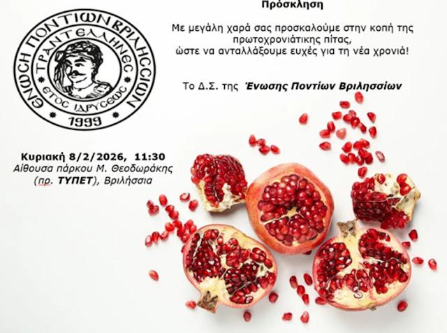 Κόβει την πίτα της η Ένωση Ποντίων Βριλησσίων και καλεί τα μέλη και τους φίλους της στην εκδήλωση που θα πραγματοποιηθεί την Κυριακή 8 Φεβρουαρίου 2026 και ώρα 11:30′ π.μ., στο Πάρκο Μίκης Θεοδωράκης – Πρώην ΤΥΠΕΤ (Αίθουσα “Νίκος Εγγονόπουλος” Π.Μπακογιάννη 38, Βριλήσσια).