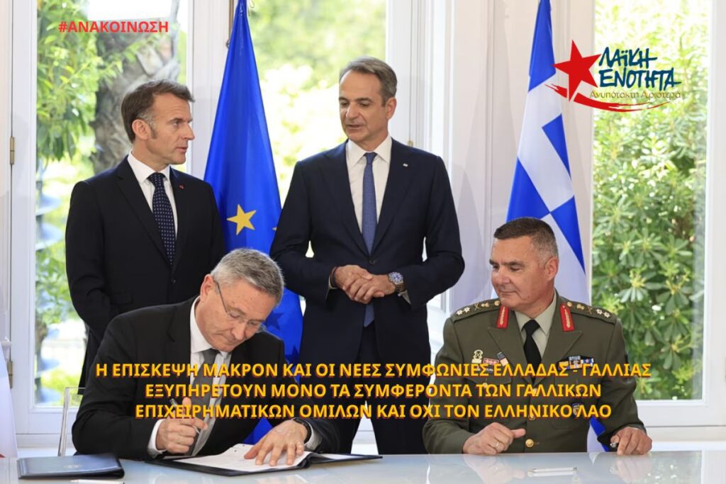 Η επίσκεψη Μακρόν και οι νέες συμφωνίες Ελλάδας – Γαλλίας εξυπηρετούν μόνο τα συμφέροντα των γαλλικών επιχειρηματικών ομίλων και όχι τον ελληνικό λαό, αναφέρει με ανακοίνωση του γραφείου τύπου η Λαϊκή Ενότητα – Ανυπότακτη Αριστερά. “Οι συμφωνίες που υπεγράφησαν και τα χρήματα που θα δοθούν από την άγρια φορολογία του ελληνικού λαού θα τονώσουν αποκλειστικά τη γαλλική πολεμική βιομηχανία”, τονίζεται χαρακτηριστικά.