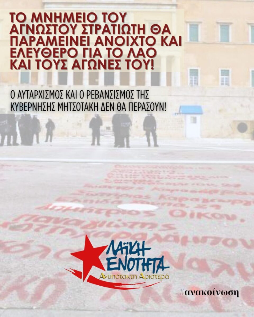 Το Μνημείο του Άγνωστου Στρατιώτη θα παραμείνει ανοιχτό για το λαό και τους αγώνες του παρά τις αντιδημοκρατικές μεθοδεύσεις της κυβέρνησης, δηλώνει με ανακοίνωση του γραφείου τύπου η Λαϊκή Ενότητα – Ανυπόταχτη Αριστερά. “Η «προστασία» του μνημείου του Αγνώστου Στρατιώτη από το Υπουργείο Εθνικής Άμυνας είναι εκδικητική για τις μεγαλειώδεις πρόσφατες κινητοποιήσεις”, αναφέρει χαρακτηριστικά η ανακοίνωση – καταγγελία του κόμματος που καλεί το λαό σε διαρκή επαγρύπνηση και αγώνα για την τήρηση του πραγματικού χαρακτήρα του Μνημείου.