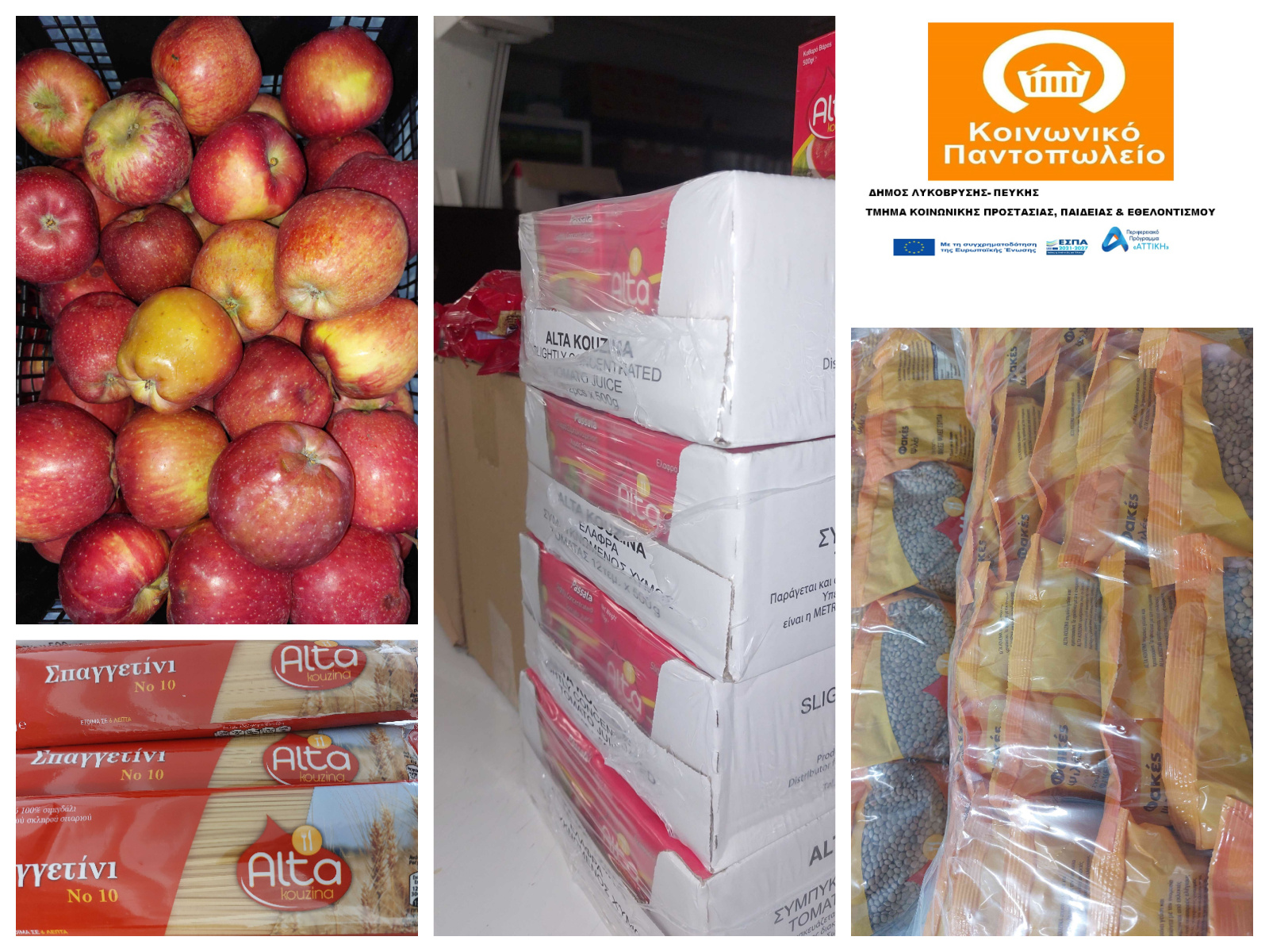 Αυτή τη φορά, το Κοινωνικό Παντοπωλείο παρέλαβε χορηγία σε ζυμαρικά, όσπρια και ντοματοχυμούς από τον Σύλλογο «Φίλοι της Θένιας», καθώς και μήλα από παραγωγό της λαϊκής αγοράς Πεύκης.