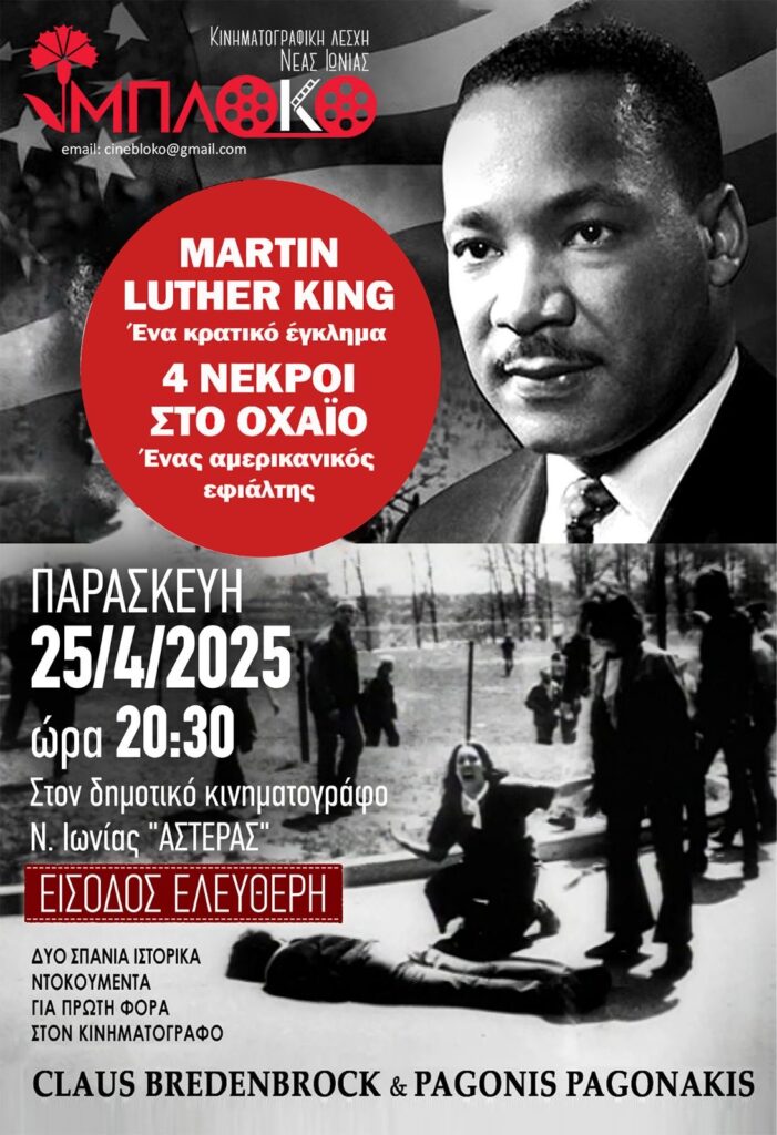 Τα συγκλονιστικά ιστορικά ντοκιμαντέρ “Martin Luther King” και “4 νεκροί στο Οχάιο” παρουσιάζει η Κινηματογραφική Λέσχη Ν. Ιωνίας “ΜΠΛΟΚΟ”.