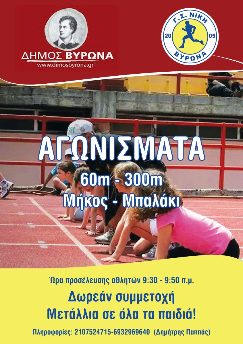 Στο πλαίσιο των εγκαινίων, ο Δήμος σε συνεργασία με τον Γυμναστικό Σύλλογο Νίκη Βύρωνα διοργανώνει αγώνες στίβου, προσφέροντας μια μοναδική αθλητική εμπειρία για παιδιά νηπιαγωγείων, δημοτικών & γυμνασίων. Στους συμμετέχοντες θα δοθούν μετάλλια.
