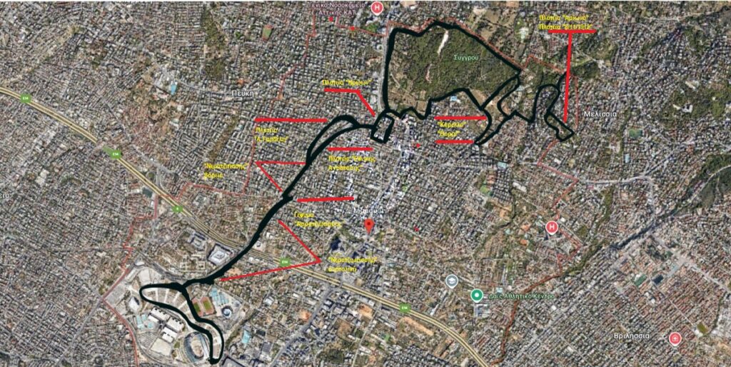 Διαδρομή: Το πεδίο του εμβληματικού έργου το οποίο προτείνουμε και που για να πραγματοποιηθεί πρέπει να προβλεφθούν οι πολεοδομικές του υποδομές στο τελικό Τοπικό Πολεοδομικό Σχέδιο που πραγματευόμαστε αυτήν την εποχή αποτελείται από τους χώρους πρασίνου και δρόμους που ακολουθούν: