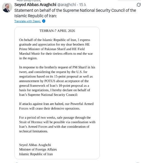 Εκεί ο Τραμπ ανακοινώνει την εκεχειρία και τη συμφωνία. Αυτή η ανακοίνωση έρχεται ως η “απάντηση” ή η οριστικοποίηση της πρόθεσης για διαπραγματεύσεις στην ιρανική πρόταση που στάλθηκε στις 7/4/2026 και φαίνεται στο κείμενο του Ιρανού Υπουργού των Εξωτερικών. Αν προσέξετε καλά την εικόνα του εγγράφου που ανέβασε ο Αμπάς Αρακτσί, γράφει στην κορυφή “TEHRAN – 7 APRIL 2026”.