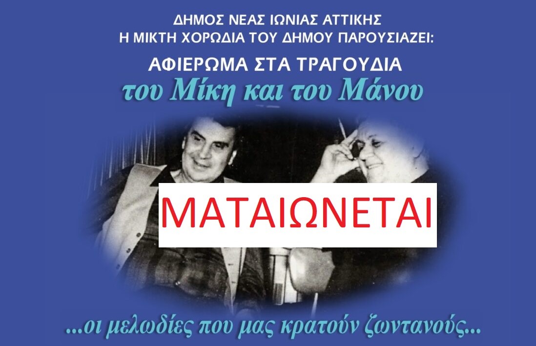 Ο Δήμος Νέας Ιωνίας ενημερώνει το κοινό ότι η προγραμματισμένη μουσική εκδήλωση «Αφιέρωμα στα τραγούδια του Μίκη Θεοδωράκη και του Μάνου Χατζιδάκι», που επρόκειτο να πραγματοποιηθεί την Κυριακή 14 Δεκεμβρίου 2025 στον Δημοτικό Κινηματογράφο «Αστέρας», ματαιώνεται μετά από απαίτηση κατόχου πνευματικών δικαιωμάτων του ενός συνθέτη