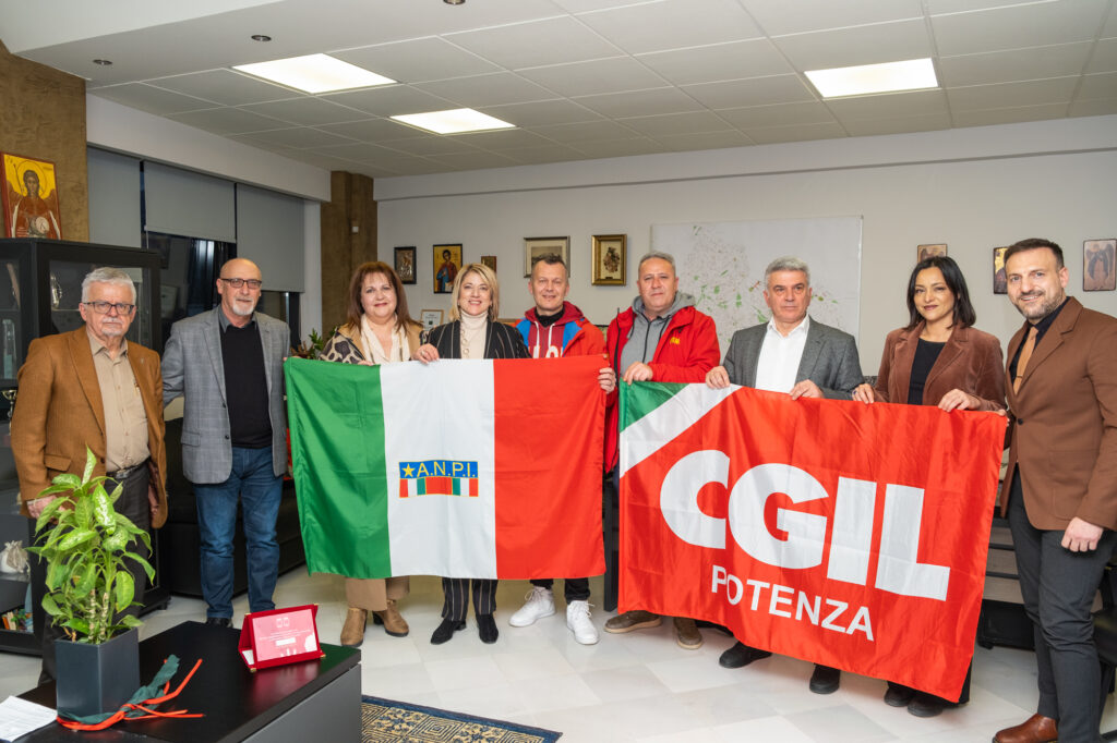 Ντανίλο ντι Κίο απόγονος του Ιταλού αντιστασιακού Αντόνιο Πελεγκρίνο που εκτελέστηκε στο Μπλόκο της Καλογρέζας και ο Βιντσέντζο Ντε Μικέλε, εκπροσώπος της ιταλικής ομοσπονδίας μετάλλου Fiom-Cgil Basilicata, στο πλαίσιο της επίσκεψης στην πόλη για τις εκδηλώσεις του Μπλόκου.