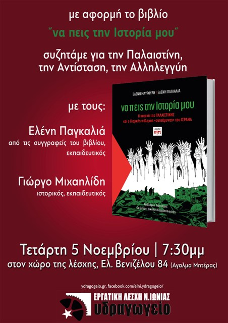 Εκδήλωση – συζήτηση παρουσίασης του βιβλίου «Να πεις την ιστορία μου», της Ελένης Μαυρούλη και της Ελένης Παγκαλιά, διοργανώνει η Εργατική Λέσχη Νεάς Ιωνίας (Ελ. Βενιζέλου 84) την Τετάρτη 5 Νοεμβρίου στις 19:30.