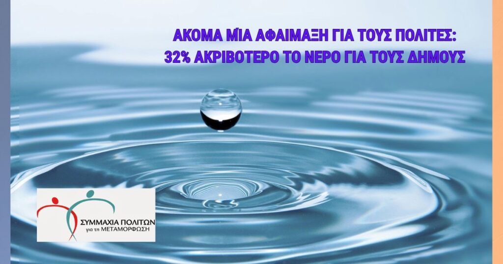 Ακόμα μια νέα αφαίμαξη για τους πολίτες καταγγέλλει η Συμμαχία Πολιτών για τη Μεταμόρφωση, καθώς, με απόφαση της ΕΥΔΑΠ ακριβαίνει κατά 32% το νερό για τους Δήμους. “Είναι κάτι παραπάνω από σίγουρο ότι το κόστος και αυτής της αύξησης θα μετακυλιστεί στους δημότες”, αναφέρει η ανακοίνωση του γραφείου τύπου της Παράταξης.