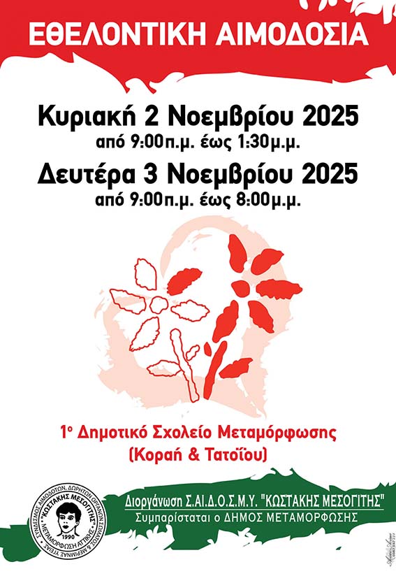 Ο Σύλλογος Αιμοδοτών και Δωρητών Οργάνων Σώματος και Μυελού των Οστών “Κωστάκης Μεσογίτης” διοργανώνει Εθελοντική Αιμοδοσία και καλεί τα μέλη και τους φίλους του σε μαζική συμμετοχή. Η δράση θα πραγματοποιηθεί την Κυριακή 2 Νοεμβρίου 2025, από τις 9.00′ π.μ. έως και τις 1.30′ μ.μ. και τη Δευτέρα 3 Νοεμβρίου 2025, από τις 9.00′ μ.μ. έως και τις 8.00′ μ.μ., στο 1ο Δημοτικό Σχολείο Μεταμόρφωσης (Κοραή και Τατοΐου).