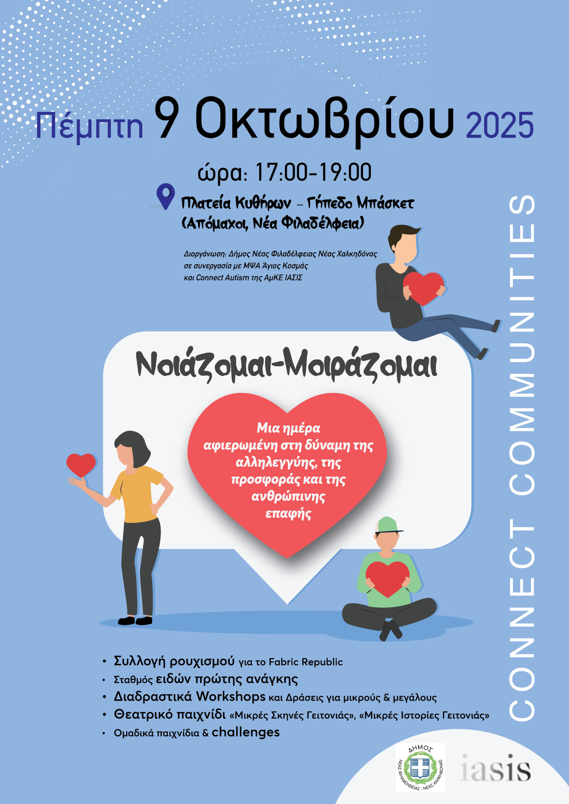Η ΜΨΑ Άγιος Κοσμάς ,το CONNECT AUTISM της ΑμΚΕ ΙΑΣΙΣ, σε συνεργασία με τον Δήμο Νέας Φιλαδέλφειας – Νέας Χαλκηδόνας,διοργανώνουν την εκδήλωση “Νοιάζομαι & Μοιράζομαι” στο Γήπεδο Μπάσκετ στην Πλατεία Κυθήρων (περιοχή Απομάχων, Νέα Φιλαδέλφεια).