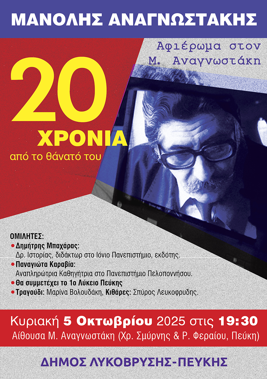 Ο Δήμος Λυκόβρυσης – Πεύκης διοργανώνει την Κυριακή 5 Οκτωβρίου 2025, στις 19:30, στην αίθουσα «Μ. Αναγνωστάκης», μια εκδήλωση αφιερωμένη στον σπουδαίο Έλληνα ποιητή Μανόλη Αναγνωστάκη με αφορμή τα 20 χρόνια από τον θάνατό του, με τίτλο: «Ο ποιητής της μνήμης και της σιωπής».