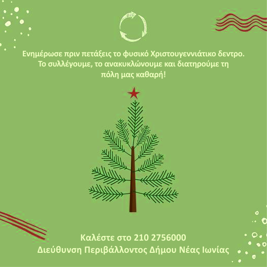 Ο Δήμος Νέας Ιωνίας ανακυκλώνει τα φυσικά Χριστουγεννιάτικα δένδρα και με ανακοίνωση του γραφείου επικοινωνίας καλεί όσους το επιθυμούν να επικοινωνήσουν με τις αρμόδιες υπηρεσίες ώστε να κανονίσουν την παραλαβή του υπό ανακύκλωση χριστουγεννιάτικου δέντρου.