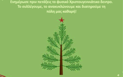 Ο Δήμος Νέας Ιωνίας ανακυκλώνει τα φυσικά Χριστουγεννιάτικα δένδρα και με ανακοίνωση του γραφείου επικοινωνίας καλεί όσους το επιθυμούν να επικοινωνήσουν με τις αρμόδιες υπηρεσίες ώστε να κανονίσουν την παραλαβή του υπό ανακύκλωση χριστουγεννιάτικου δέντρου. Αναλυτικά, η ανακοίνωση του γραφείου επικοινωνίας του Δήμου Ν. Ιωνίας έχει ως εξής: Ανακυκλώνουμε το φυσικό Χριστουγεννιάτικο δέντρο! Επικοινωνήστε … Συνεχίστε να διαβάζετε το Ο Δήμος Νέας Ιωνίας ανακυκλώνει τα φυσικά Χριστουγεννιάτικα δένδρα.