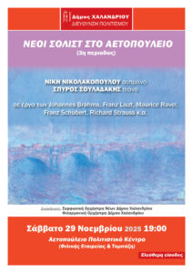 Ξεκινά ο 3ος κύκλος των συναυλιών με τίτλο “Νέοι σολίστ στο Αετοπούλειο” της Συμφωνικής Ορχήστρας Νέων του Δήμου Χαλανδρίου. Η πρώτη συναυλία με πρωταγωνιστές τη