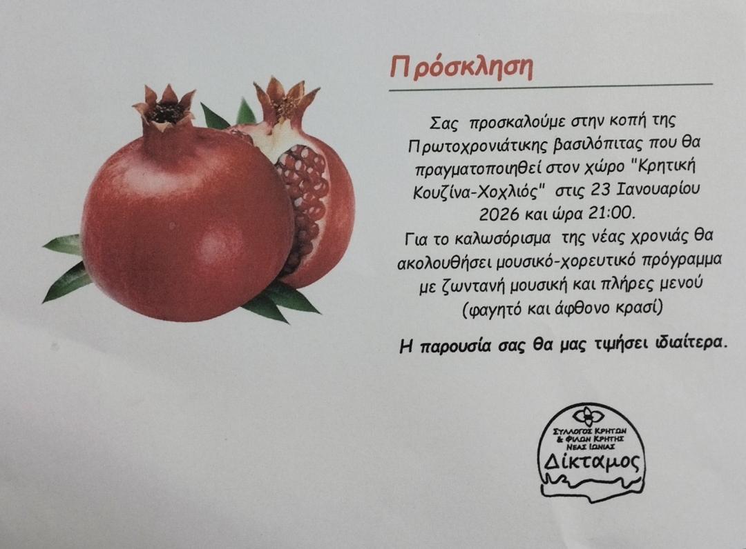 Ο Σύλλογος Κρητών και Φίλων Κρήτης Ν. Ιωνίας “Δίκταμος” κόβει την βασιλόπιτα του και καλεί τα μέλη και τους φίλου του στην εκδήλωση. Η εκδήλωση θα πραγματοποιηθεί την Παρασκευή, 23 Ιανουαρίου 2026 και ώρα 9:00′ μ.μ., στον χώρο “Κρητική κουζίνα-Χοχλιός” (Κανάρη 7, Ηράκλειο).