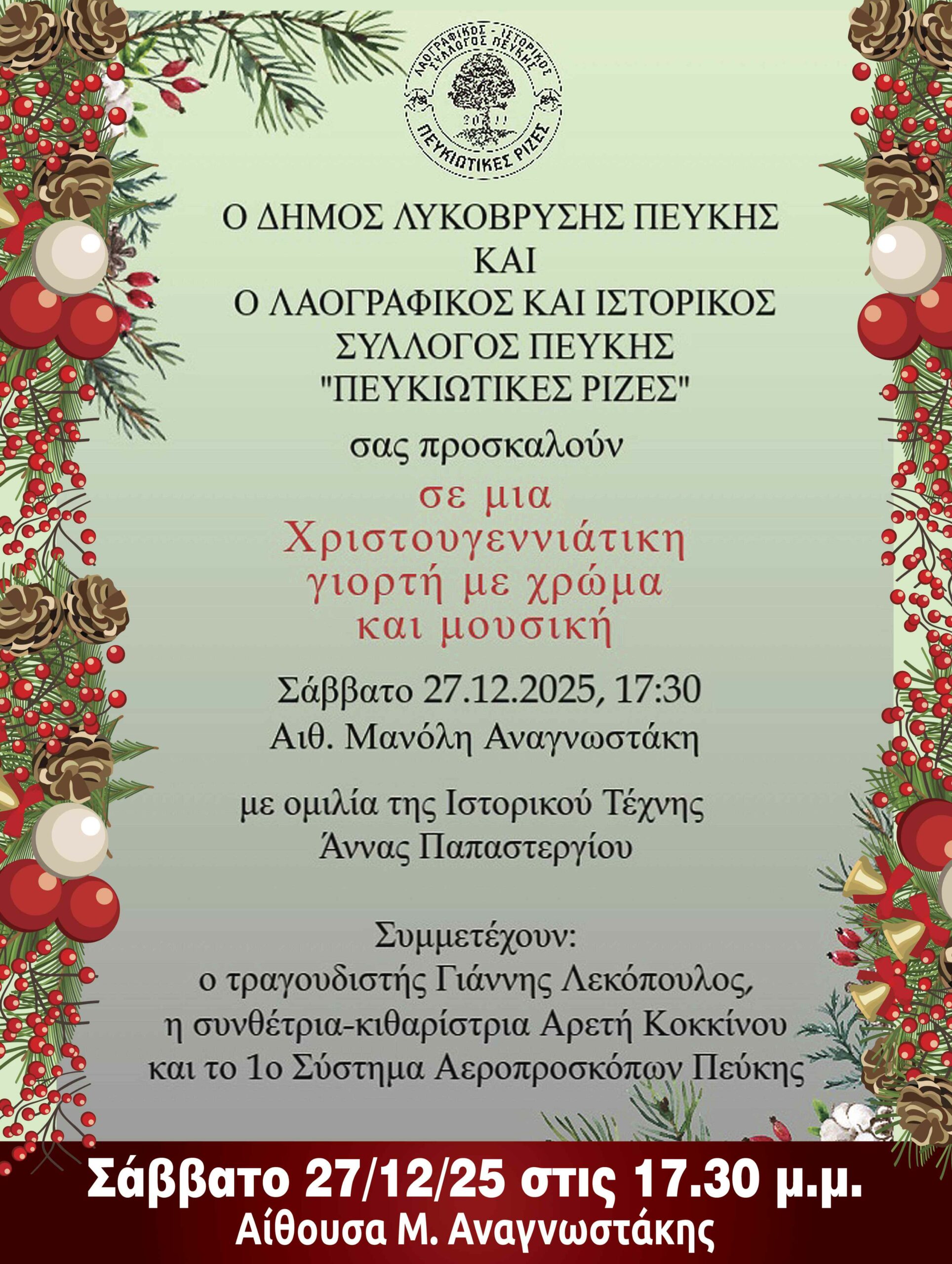 Ο Λαογραφικός και Ιστορικός Σύλλογος Πεύκης “Πευκιώτικες Ρίζες” διοργανώνει Χριστουγεννιάτικη εκδήλωση. Η εκδήλωση που γίνεται σε συνεργασία με τον Δήμο Λυκόβρυσης – Πεύκης, θα πραγματοποιηθεί το Σάββατο 27 Δεκεμβρίου 2025, στις 5.30′ μ.μ. στην Αίθουσα Μανόλη Αναγνωστάκη (Χρυσοστόμου Σμύρνης & Ρήγα Φεραίου, Πεύκη).