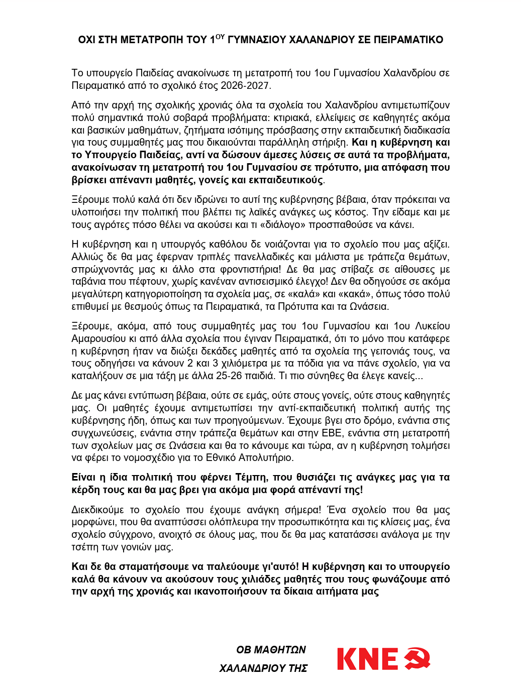 Ο.Β. Χαλανδρίου της ΚΝΕ: “Όχι στη μετατροπή του 1ου Γυμνασίου σε Πειραματικό”