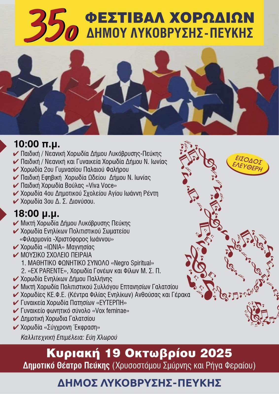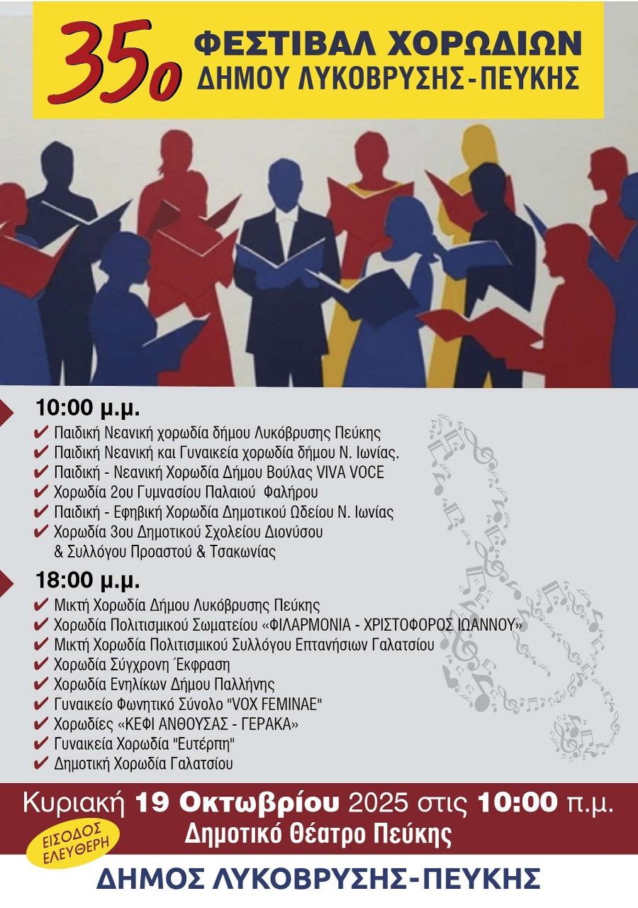Δήμου Νέας Ιωνίας θα συμμετάσχουν στο 35ο Φεστιβάλ Χορωδιών Δήμου Λυκόβρυσης – Πεύκης, την Κυριακή 19 Οκτωβρίου 2025, από 10:00 έως 14:00, στο Δημοτικό Θέατρο Πεύκης.