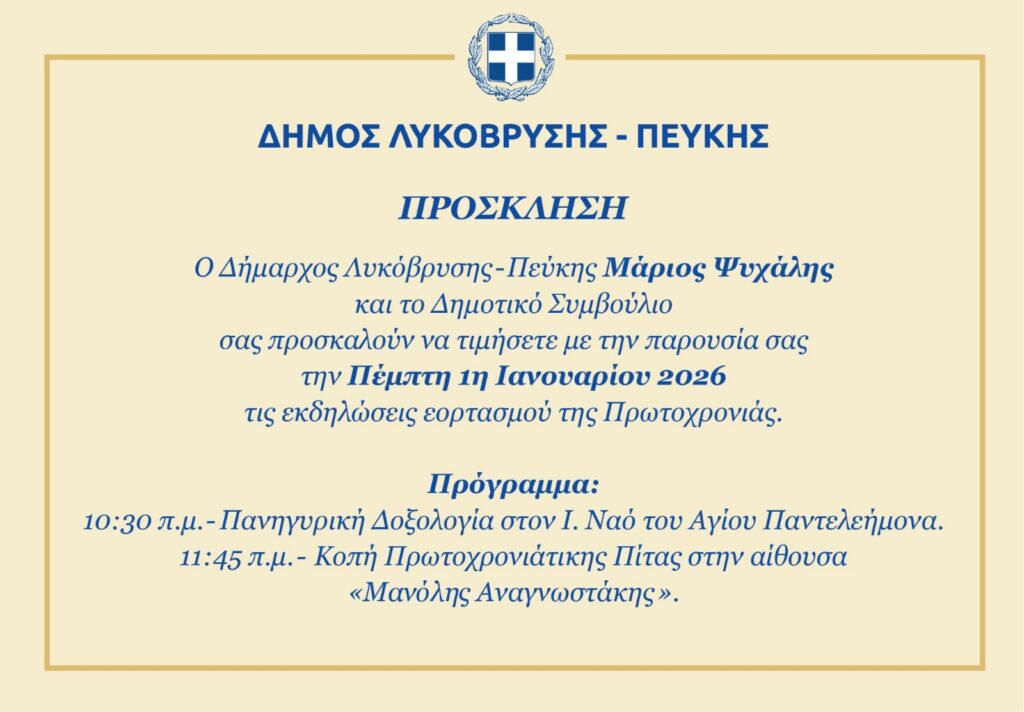 Ο Δήμος Λυκόβρυσης – Πεύκης παράλληλα εύχεται σε όλους τους δημότες καλή χρονιά, με υγεία, ειρήνη και δημιουργικότητα.