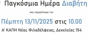 Πέμπτη 13 Νοεμβρίου 2025, στις 10:00 π.μ., στο Α’ ΚΑΠΗ Νέας Φιλαδέλφειας (Δεκελείας 154) η δράση ενημέρωσης, με αφορμή την Παγκόσμια Ημέρα Διαβήτη Στο πλαίσιο