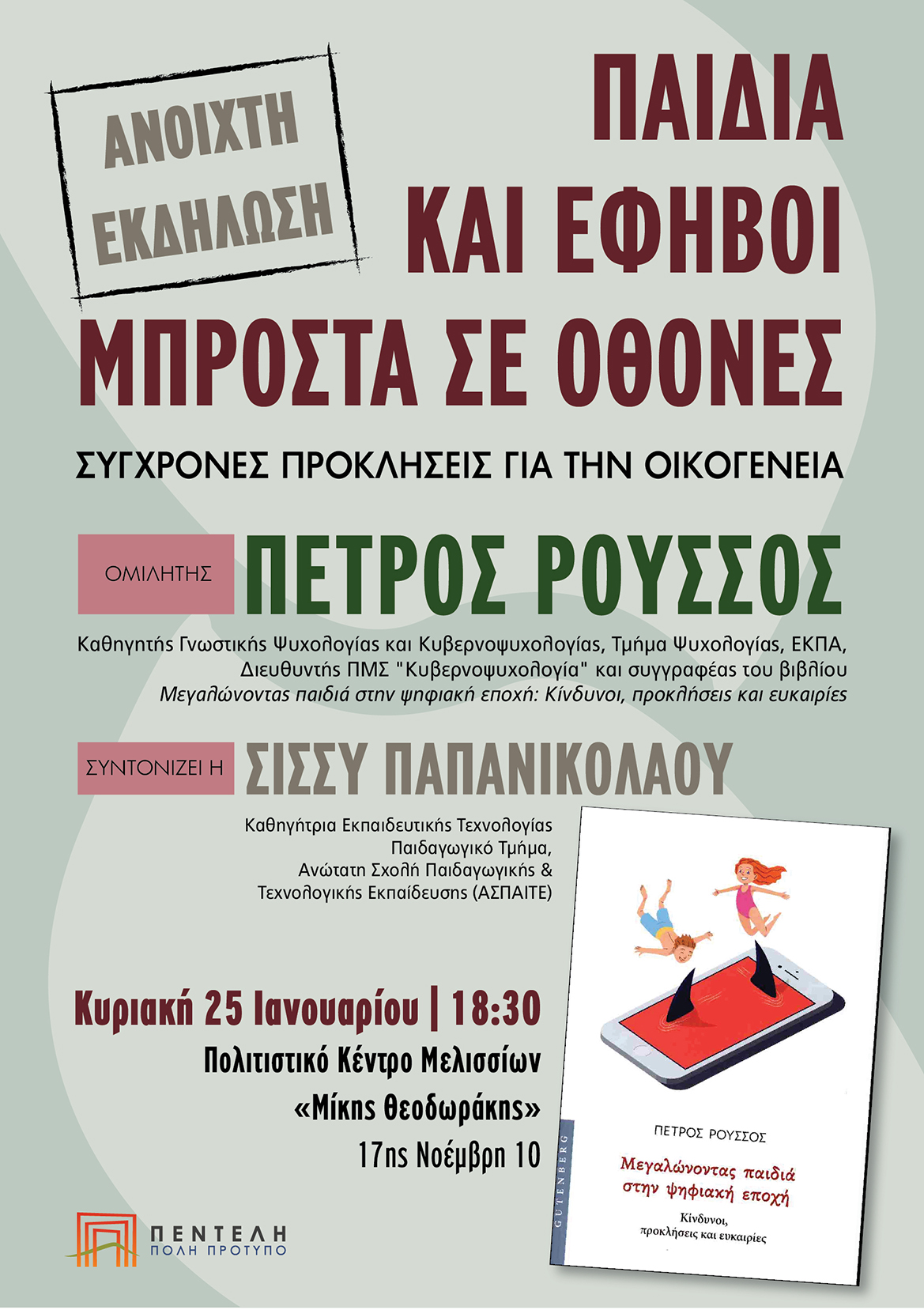 Ομιλητής στην εκδήλωση θα είναι ο Πέτρος Ρούσσος, Καθηγητής Γνωστικής Ψυχολογίας και Κυβερνοψυχολογίας του ΕΚΠΑ και συγγραφέας του βιβλίου “Μεγαλώνοντας παιδιά στην ψηφιακή εποχή: Κίνδυνοι, προκλήσεις και ευκαιρίες”.